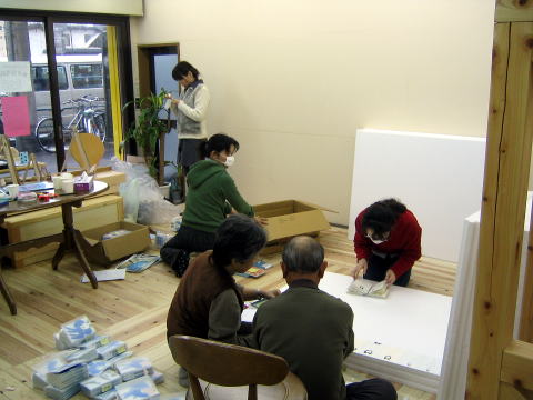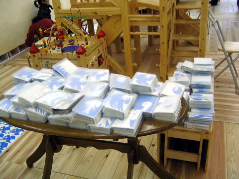 ![]() ボードに展示しきれなかった作品は一枚ずつファイルに入れて展示しました。 机にも置ききれないほどの量でした。さすがに一万点の作品をこうしてみると迫力があります。 |