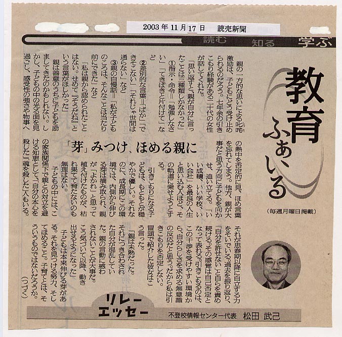 > 読売新聞2003年11月17日(3回シリーズの2回目)