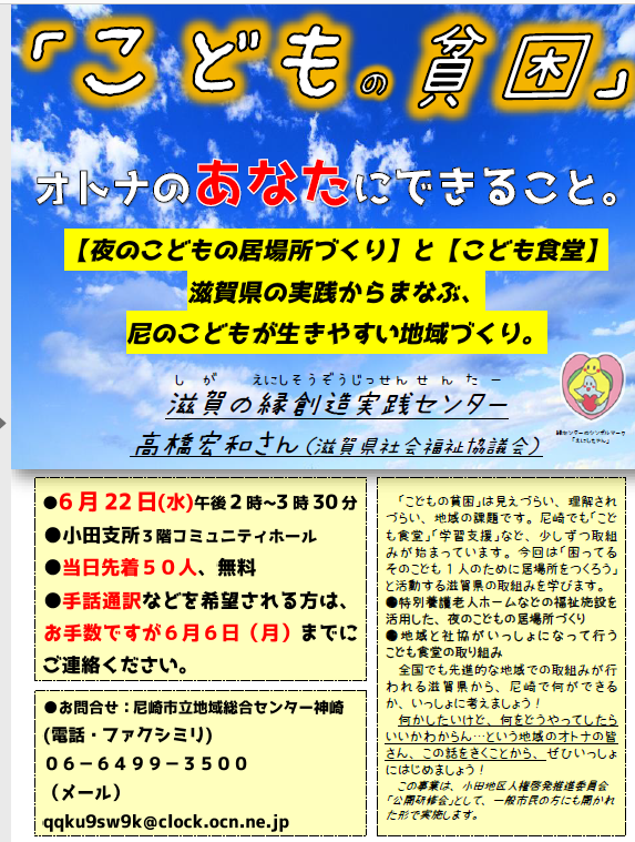 「こどもの貧困」オトナのあなたにできること 開催日: 2016年6月22日 投稿者: admin-m 日時:2016年6月22日午後2時から3時30分 場所:兵庫県尼崎市・小田支所3階コミュニティホール